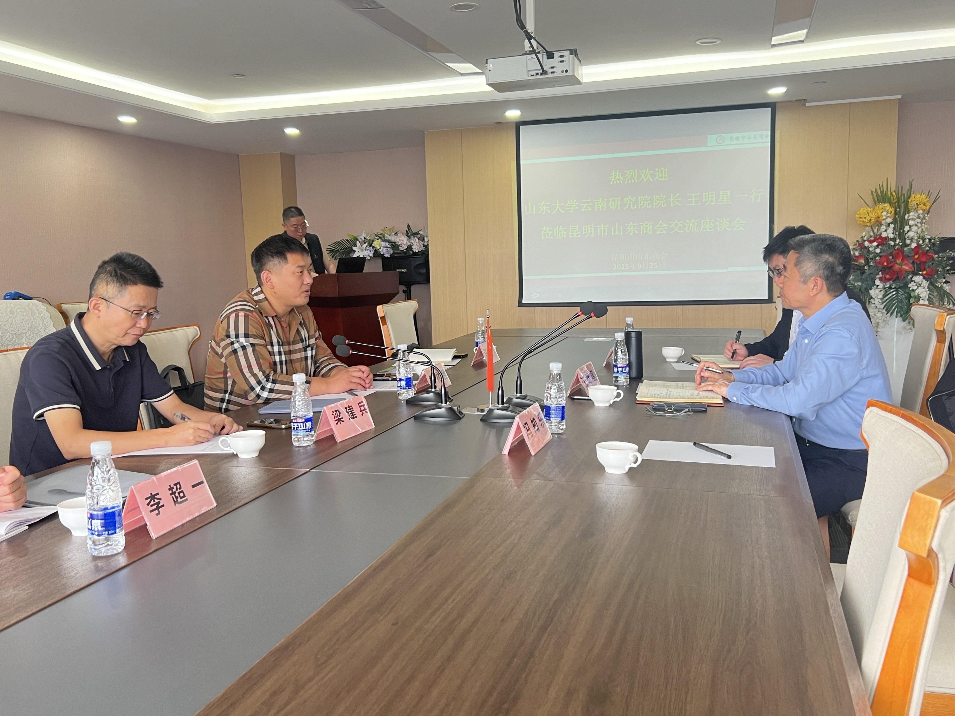 昆明市山东商会会长解兆胜对王明星院长一行的到访表示热烈欢迎。他介绍了商会的发展历程、会员构成以及近年来在促进鲁滇两省经济文化交流、服务会员企业方面所做的工作。会长表示,山东大学是享誉海内外的百年名校,科研实力雄厚,人才资源丰富。云南研究院的成立,为在滇的山东籍企业和人士提供了强大的智力后盾和精神纽带。商会高度重视此次交流,将积极发挥其桥梁纽带作用,引导会员企业主动对接研究院的科技与人才资源,推动实质性项目合作,实现“校企共赢、共同发展”。