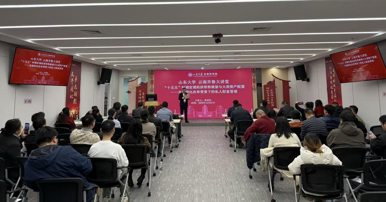 2025年12月27日,由山东大学云南研究院举办的“山东大学云南齐鲁大讲堂”第二期活动在昆明恒隆广场成功举行,本次活动获中国工商银行昆明汇通支行、太平人寿的大力支持。本期讲堂聚焦“十五五”时期宏观经济形势展望与大类资产配置、全面深化改革背景下的私人财富管理等前沿议题,吸引了来自滇中新区各级政府和企事业单位、昆明市山东商会、山东大学同等学力申硕班研究生、山东大学云南校友会等50余家单位参会,现场反响热烈。活动由山东大学云南研究院院长王明星主持。