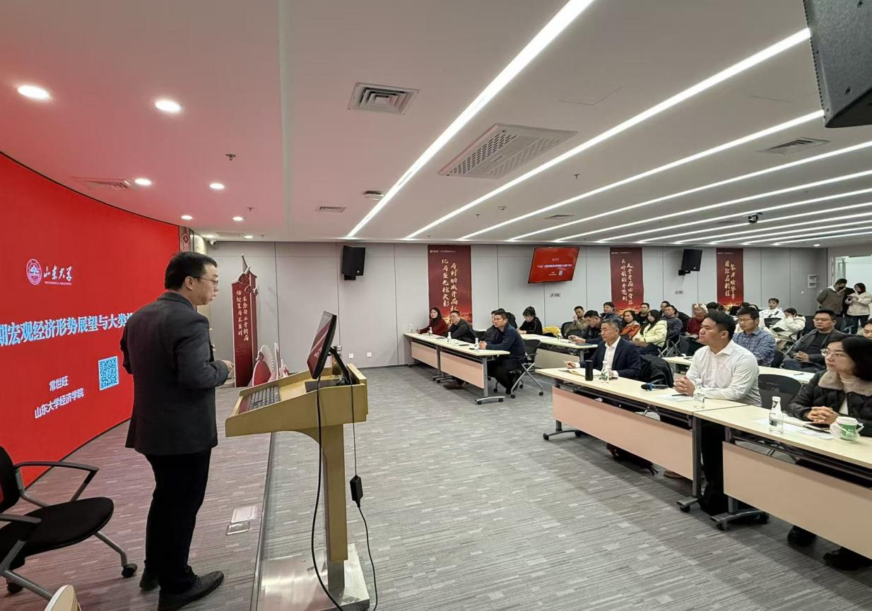 活动特邀国内知名财税专家、山东财政改革发展研究院研究员、山东大学经济学院常世旺副教授担任主讲。常世旺副教授以其深厚的学术积淀与丰富的政策实践,为现场听众带来了一场紧扣时代脉搏、兼具理论深度与实践指导意义的高水平讲座。他系统剖析了当前宏观经济面临的“有效需求不足”、“部分行业产能过剩”、“社会预期偏弱”等核心挑战,并结合“十五五”时期发展新趋势,深入阐述了加快发展新质生产力、提振内需、优化供给结构等国家战略方向的深刻内涵。在复杂的经济图景下,讲座清晰勾勒了短期经济恢复性增长与中长期向高质量、防风险转型的辩证关系。